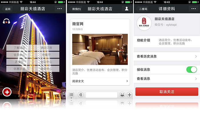 5、提供服務(wù):用戶直接可在公眾賬號進行預(yù)約房間、預(yù)約餐廳等操作。
